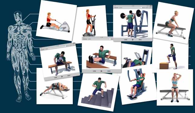 Hundreds of exercise images, animations, and instructions. Exercises are categorized by type, targeted muscles, difficulty level, equipment, and more.